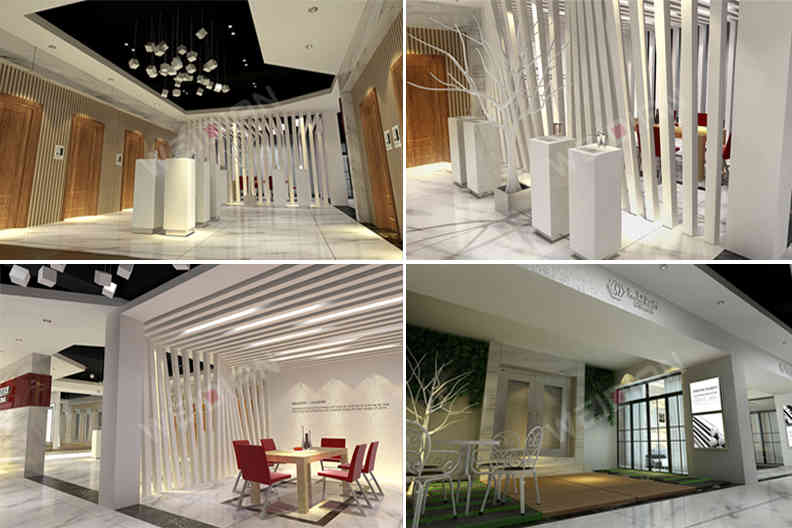 整個展臺設(shè)計方案簡潔大氣,外觀與陳列展示的修飾沒有過度消費,塊面直線條干凈利落,玻璃和鏡面不銹鋼營造空間的通透和延伸,簡約質(zhì)樸的材料做出優(yōu)雅和品味,更能適應(yīng)現(xiàn)代未來高效快捷的特點。合理明智的選材及完美的運用使整體看起來極具品質(zhì)感,設(shè)計師還注重生態(tài)的營造,綠化穿梭連貫活潑