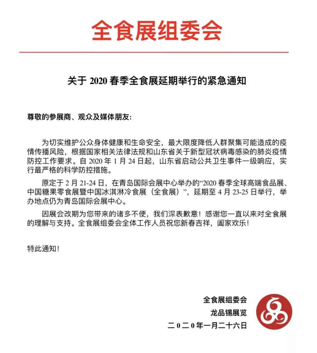 2020春季全球高端食品展、中國糖果零食展暨中國冰淇淋冷食展(簡稱2020年春季全食展),將原定舉辦時間2月21-24日,延期至4月23-25日,舉辦地點仍為青島國際會展中心。