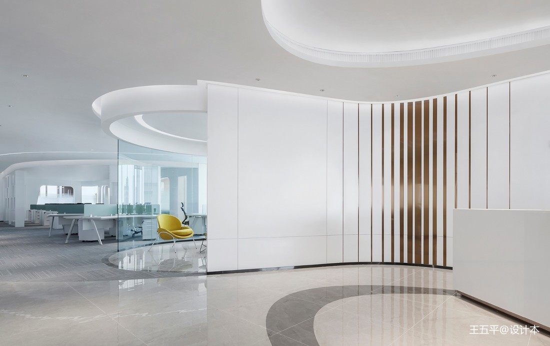 本項目盤踞于南寧市五象新區,恢弘大氣。室內辦公大堂則延續了建筑風格,糅合了科技與藝術的理念,以創新的手法抒寫現代化辦公國際風貌。中空大堂的室內有三層之高,四周柱子撐起了豪邁的空間風骨,設計以白色為主色,搭配以綠、藍、褐,藉由造型和色彩的純粹性,帶來無與倫比的審美享受。